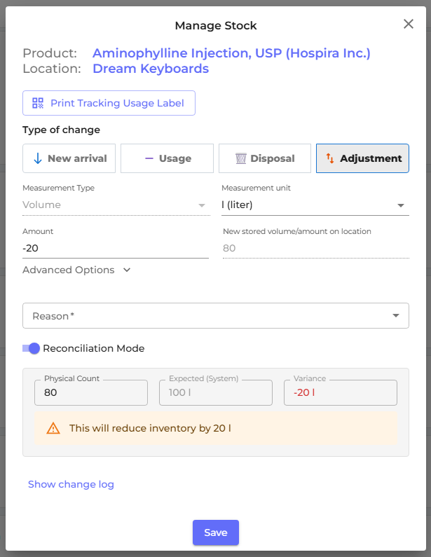 Inventory Adjustment with Reason Codes You can now correct stock discrepancies without misusing "Usage" or "Disposal" entries. A new Adjustment transaction type lets you enter a physical count, and the system automatically calculates the variance. A mandatory reason code must be selected (Count correction, Spillage/breakage, Evaporation/shrinkage, Found stock, Transfer correction, Expired removal, or Other) — keeping your audit trail clean and compliance-ready.