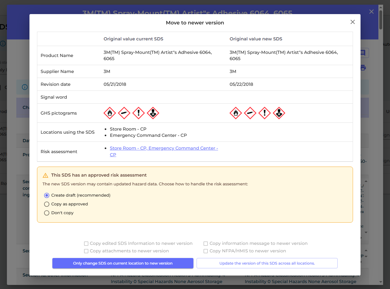 Risk Assessment Revision Workflow on SDS Version Upgrade When upgrading an SDS to a newer version, you now have explicit control over what happens to its risk assessment. Instead of the old silent "copy as approved" checkbox, a highlighted info card presents three options: