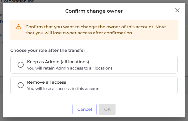 Role Selection for Previous Owner During Ownership Transfer When transferring account ownership, you now choose what happens to the outgoing owner before confirming:
