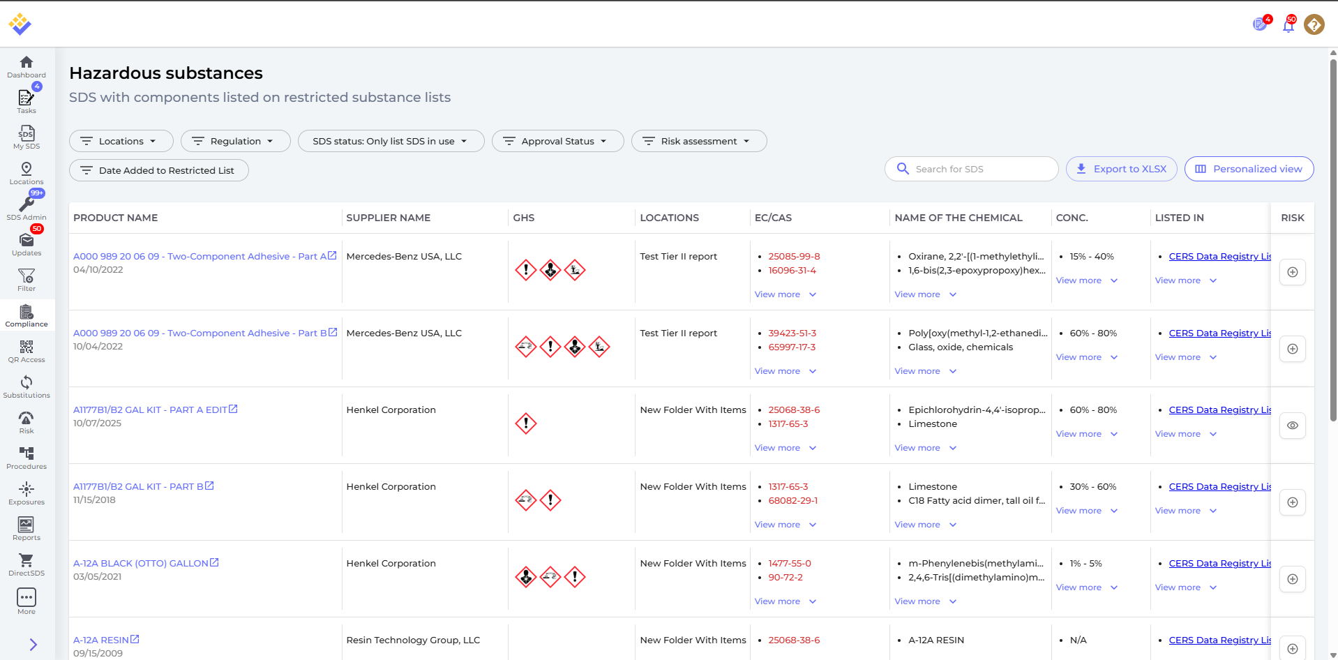 - New panel on Dashboard showing active SDS with ingredients on restricted chemical lists.