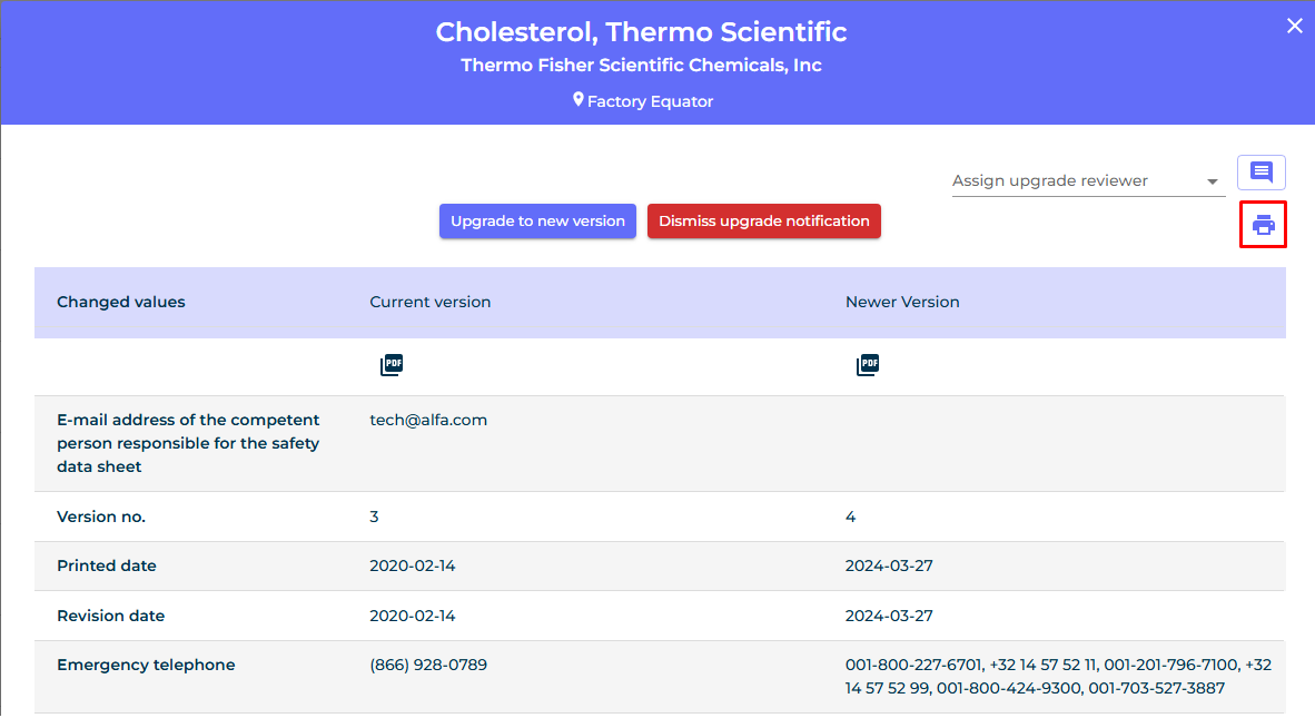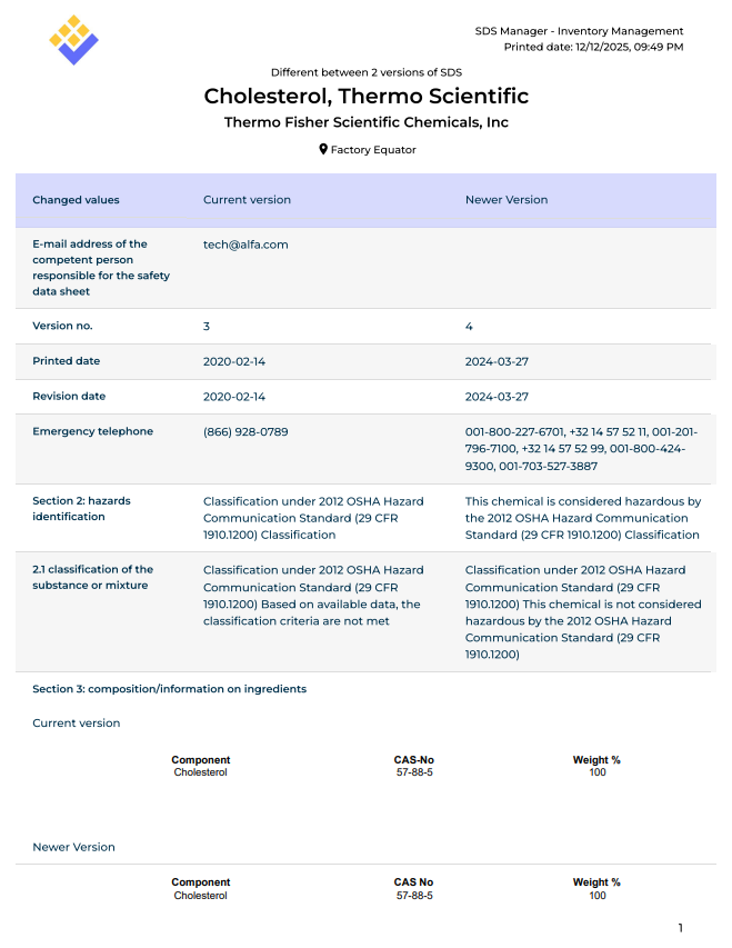 Added the ability to print and review differences between the old and new versions of an SDS, making it easier to verify changes before approval or use.