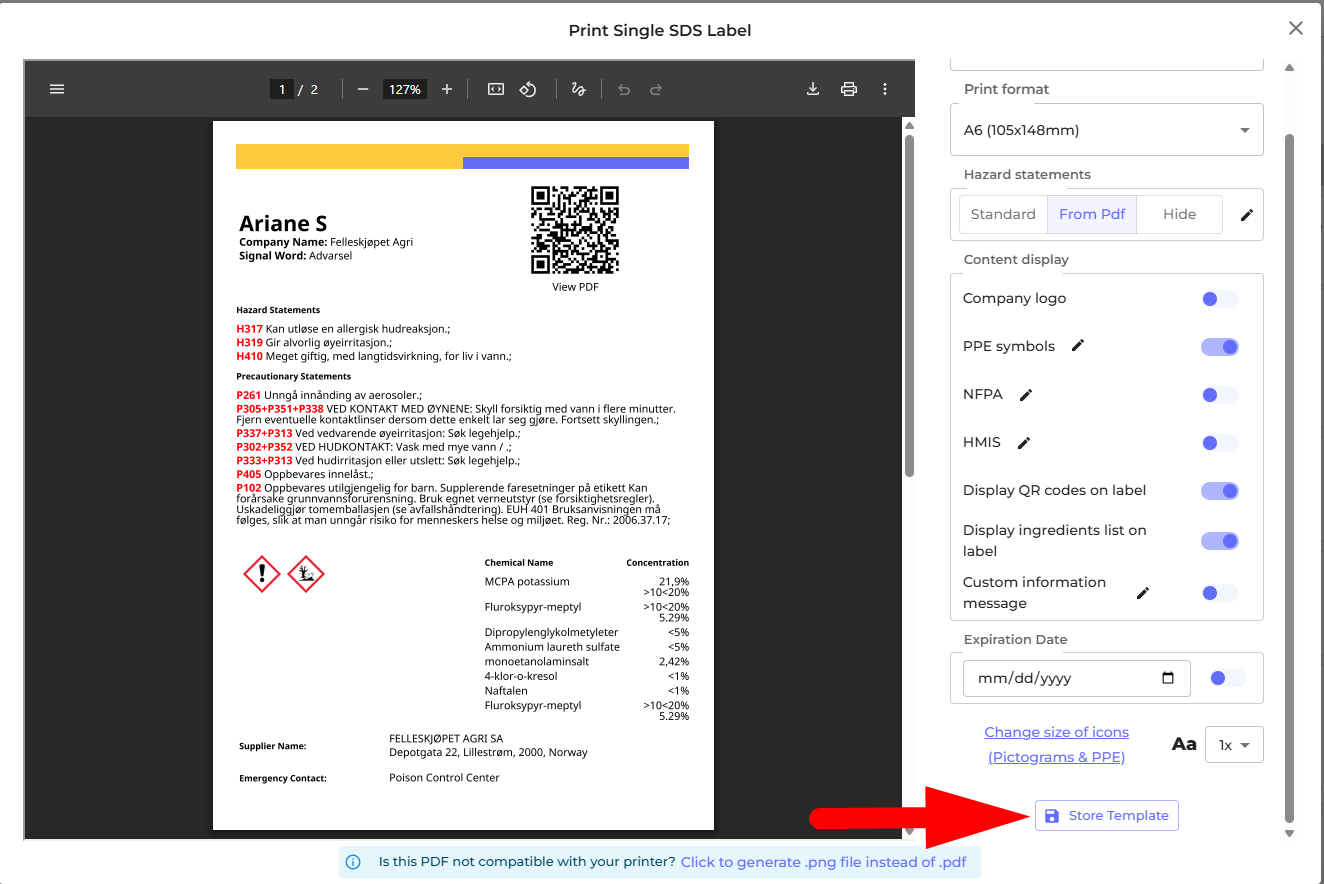 New toggles let you select exactly which information should be displayed on the label (e.g., hazard statements, precautionary statements, PPE icons).