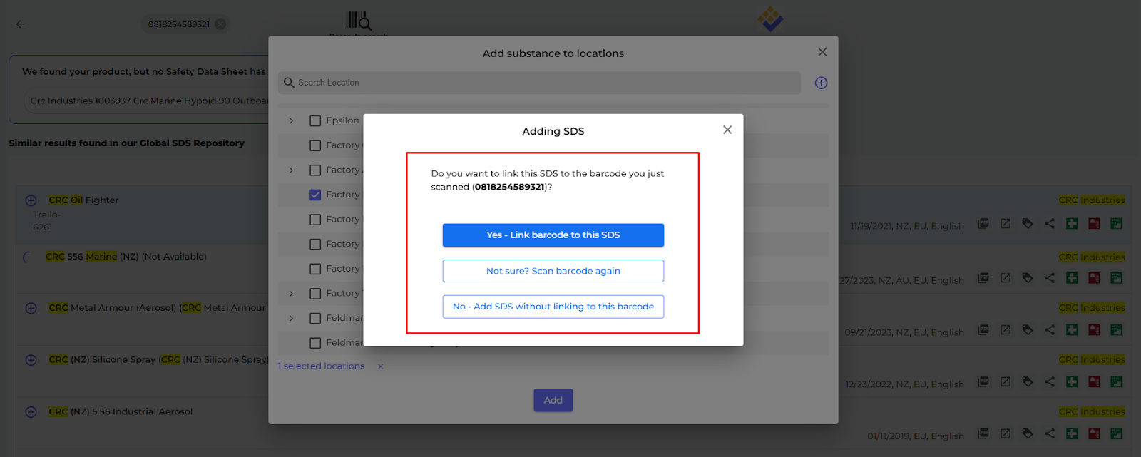 Once the barcode is successfully re-scanned, users can continue adding the SDS using the updated barcode.